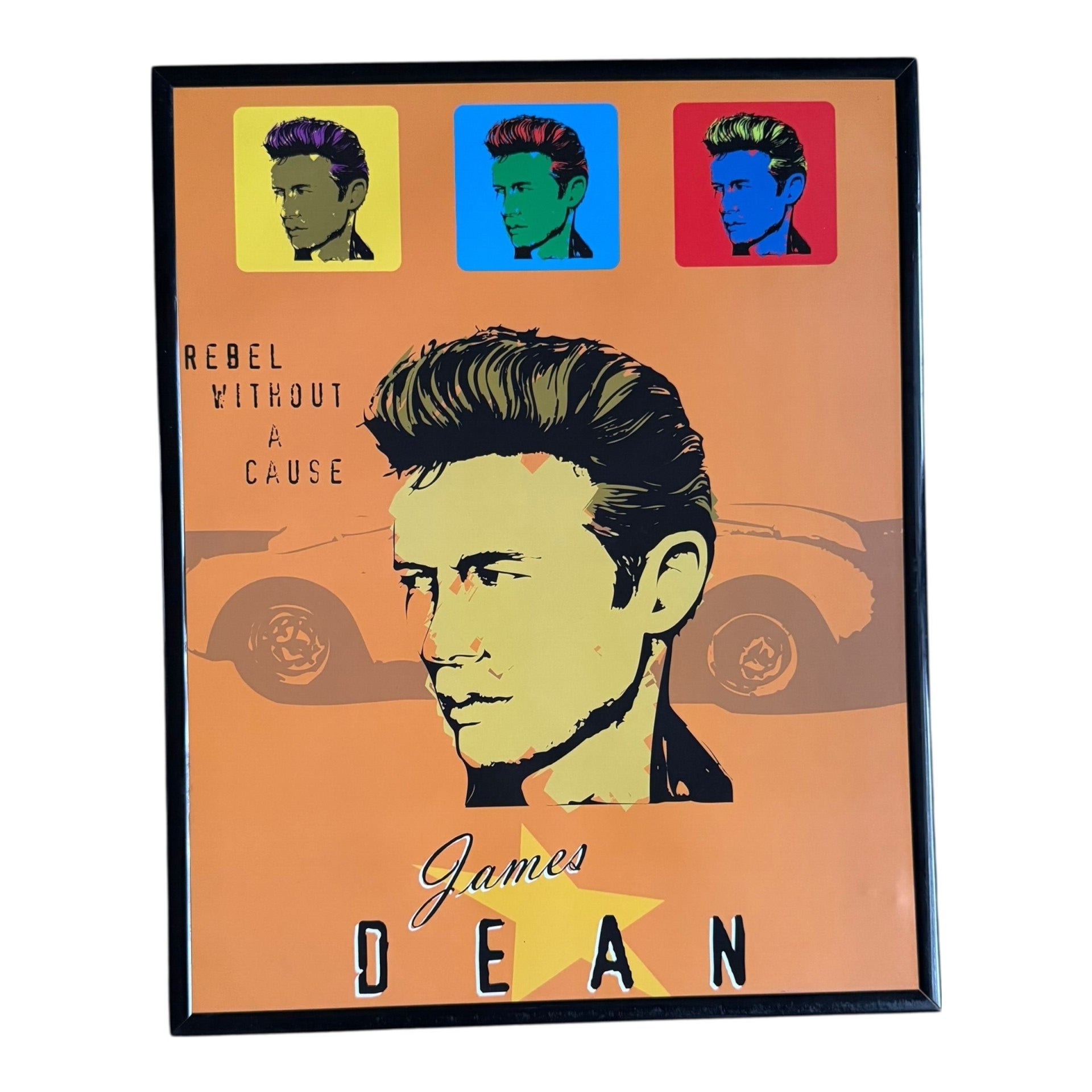 Toffe pop-art stijl James Dean poster in een zwarte lijst. Het ontwerp heeft meerdere kleurrijke portretten en een grote centrale afbeelding van James Dean in retro stijl.