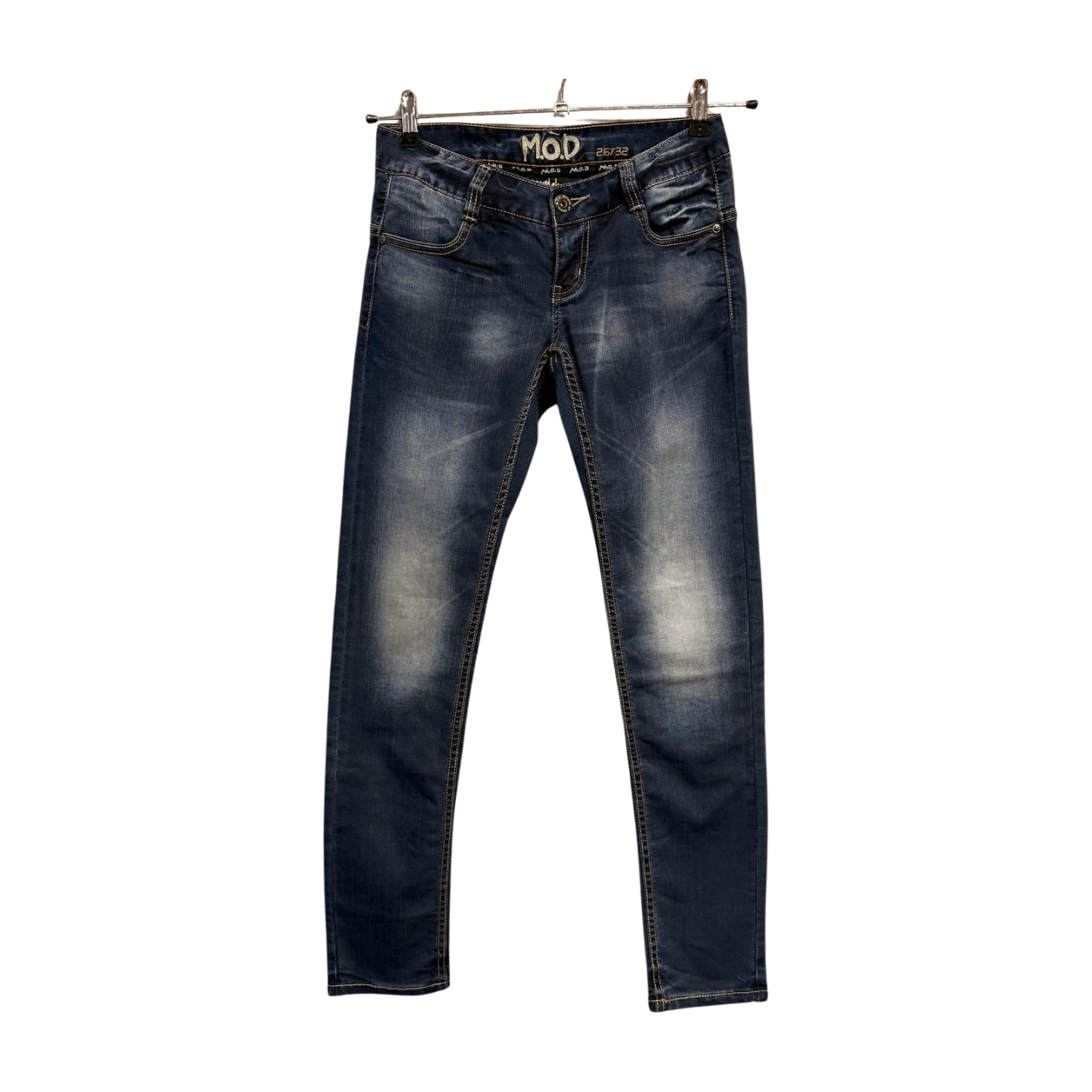 Stoere donkerblauwe skinny jeans van M.O.D in maat 26/32. Deze jeans heeft een mooie used wash met lichte vervagingen op de benen, wat zorgt voor een moderne en speelse uitstraling. De achterkant heeft opvallende zakken met stiksels die de broek net dat beetje extra geven.