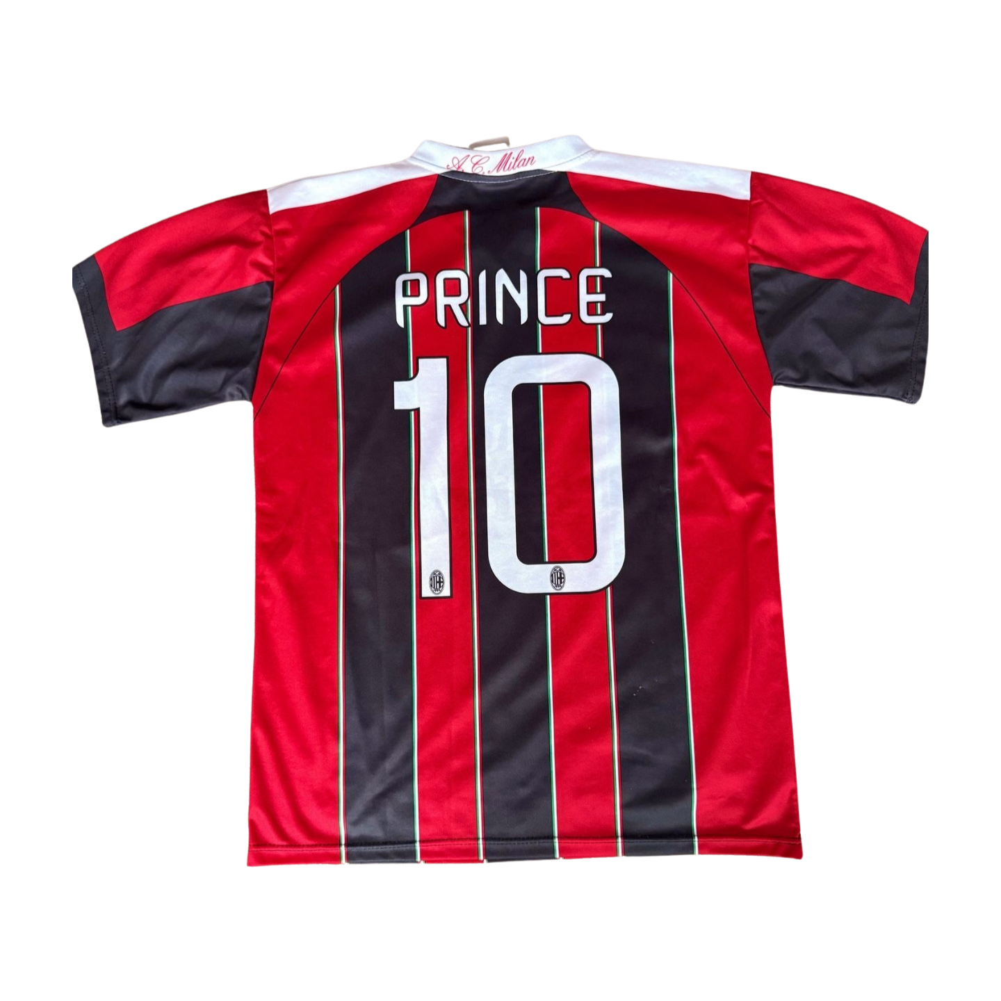 Rood-zwart AC Milan voetbalshirt met rugnummer 10 Prince. Het shirt heeft de klassieke AC Milan kleuren en “Fly Emirates” sponsorlogo op de voorkant.