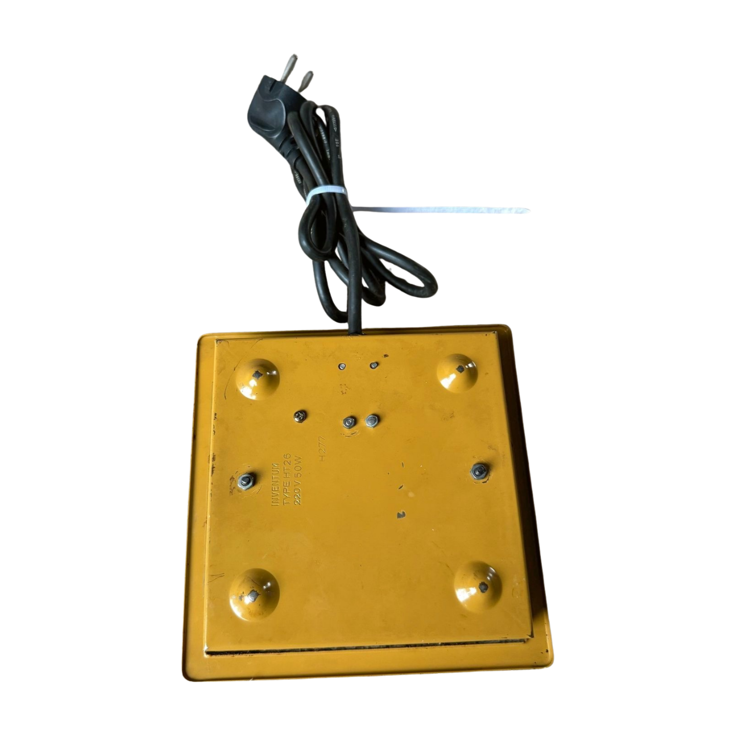 Retro warmhoudplaat uit de jaren 70 in gele kleur met sierlijke bloemenprint. Perfect als warmhouder voor koffie, thee of pannen, maar ook ideaal als retro decoratiestuk in keuken, camper of vintage interieur. Stevig metalen ontwerp met mooie nostalgische details. Werkt op 220V.