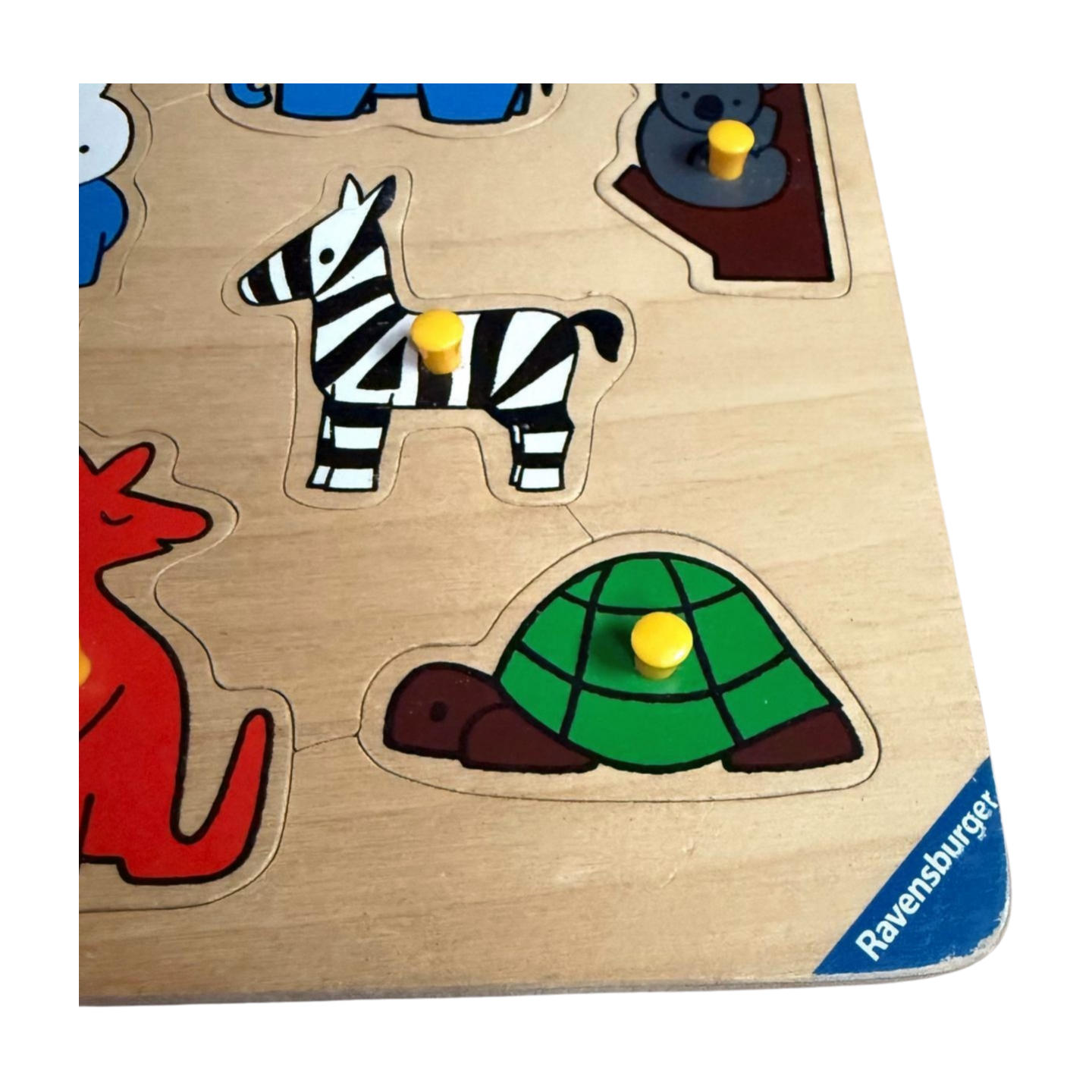 Het bord bevat vrolijke dierfiguren en Nijntje, perfect voor peuters om vormen, dieren en motoriek te oefenen.