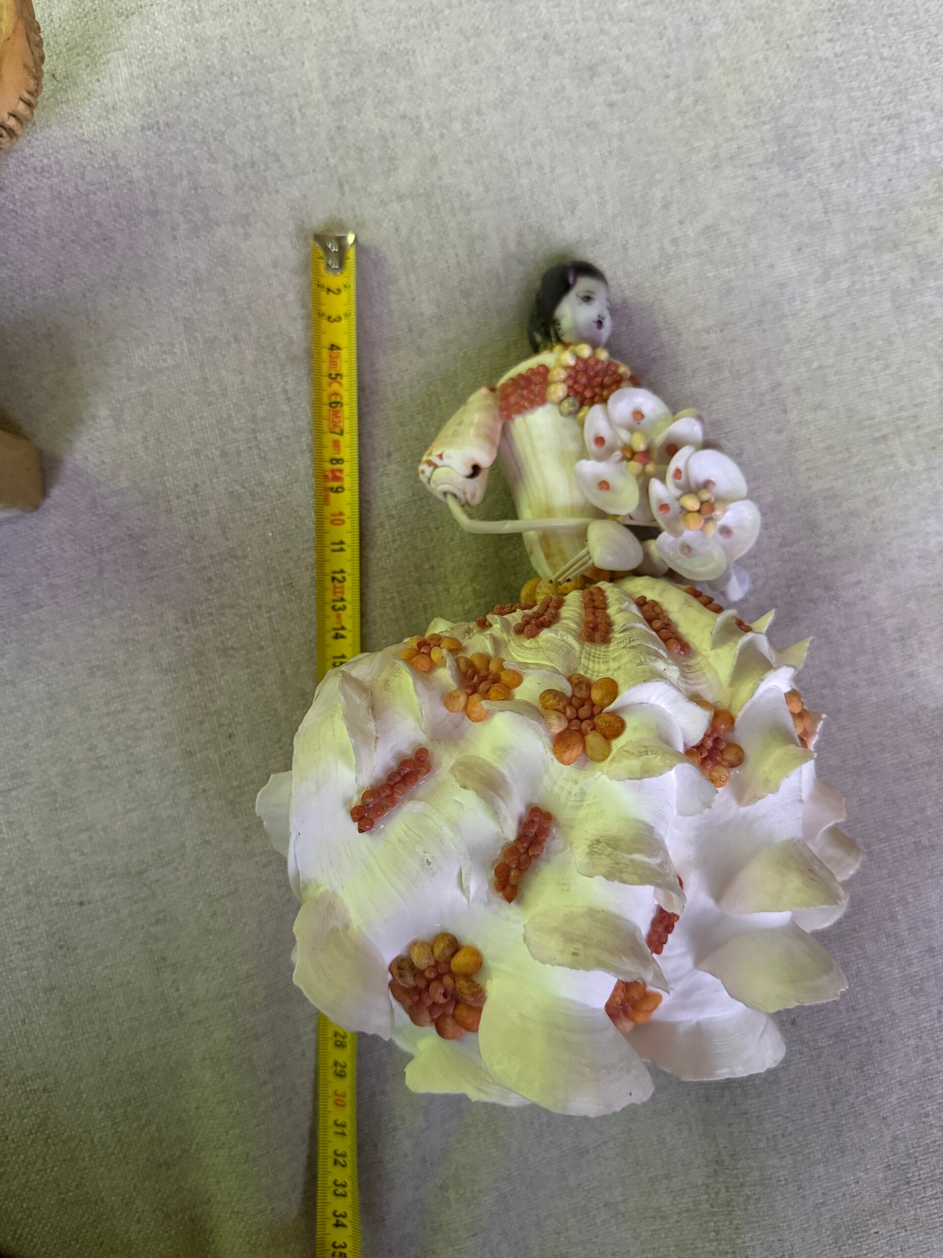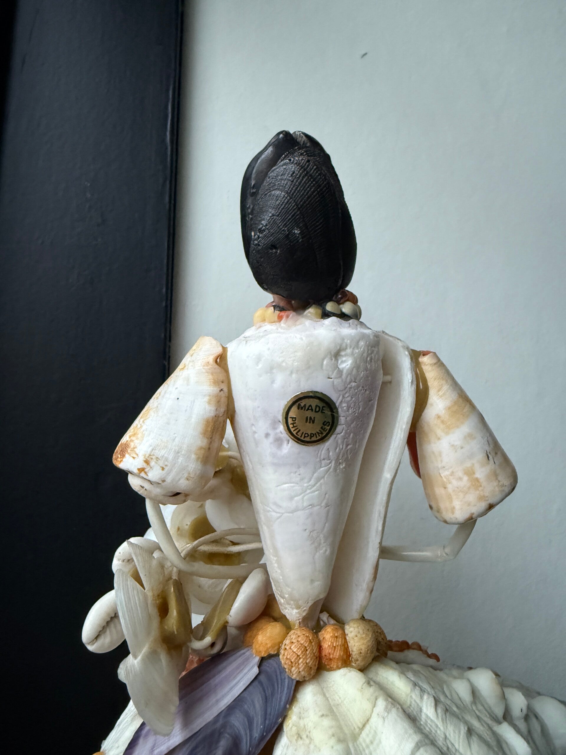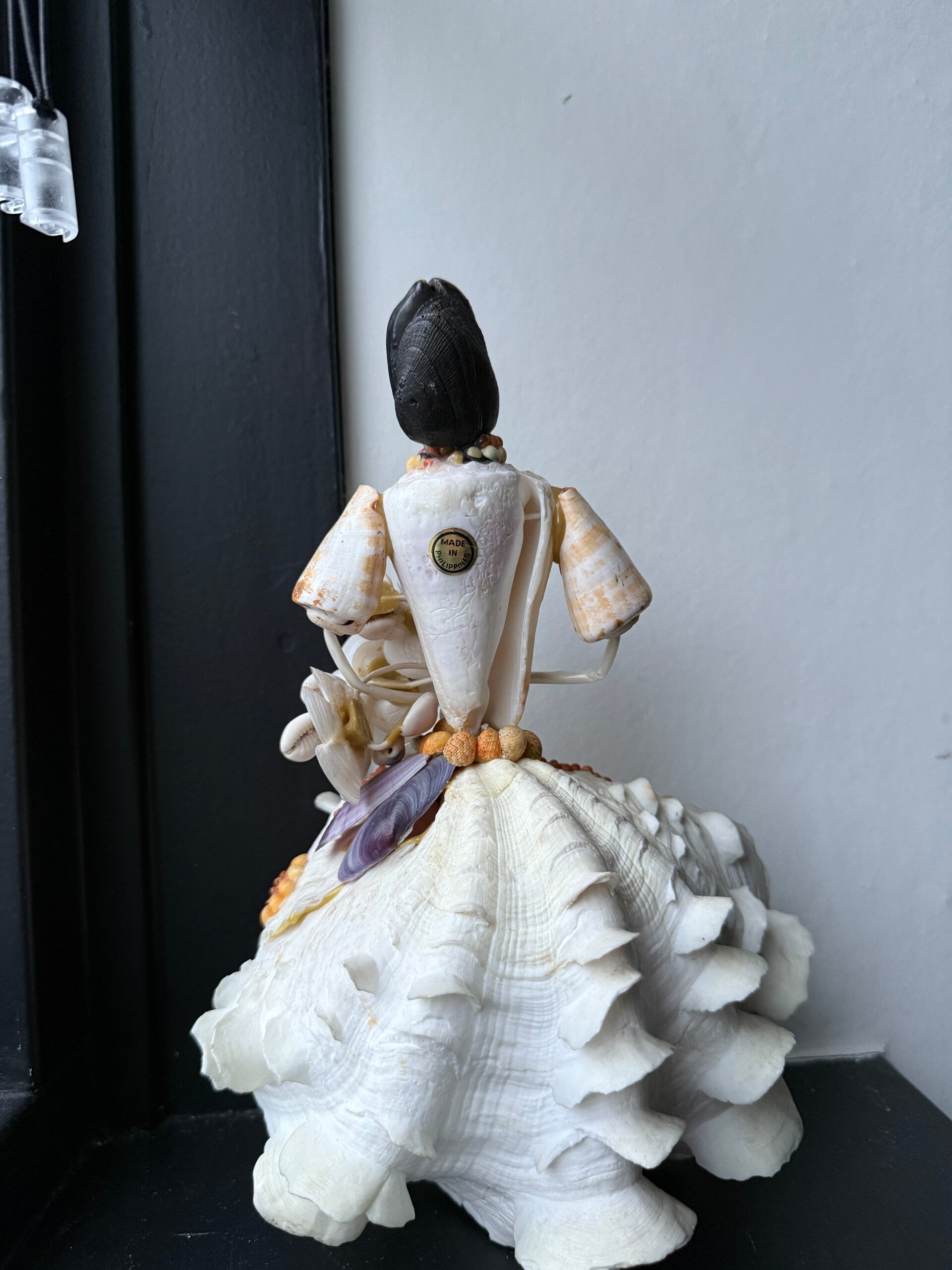 Dit prachtige vintage schelpenbeeldje is volledig met de hand gemaakt van echte schelpen. De jurk bestaat uit lagen natuurlijke schelpen met bloemdetails, en het gezicht is zorgvuldig beschilderd. Een bijzonder en decoratief item voor in huis, ideaal voor liefhebbers van stranddecor, curiosa en vintage verzamelobjecten.