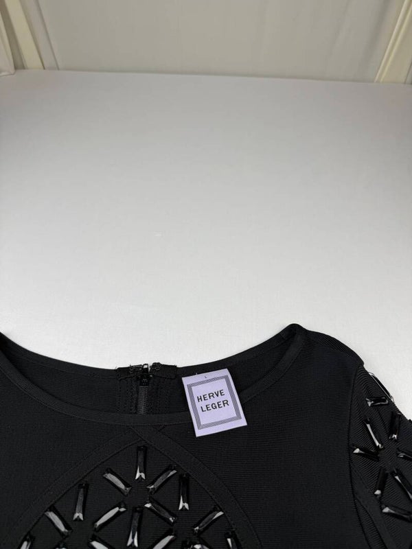 Exclusieve Hervé Léger cropped top in het zwart, met prachtige cut-out details en luxe glanzende embellishments op de mouwen en voorkant. Gemaakt van stevige kwaliteit stof, valt mooi aangesloten en heeft een dubbele ritssluiting op de rug. Perfect voor een avondje uit, feest of chique gelegenheid.
