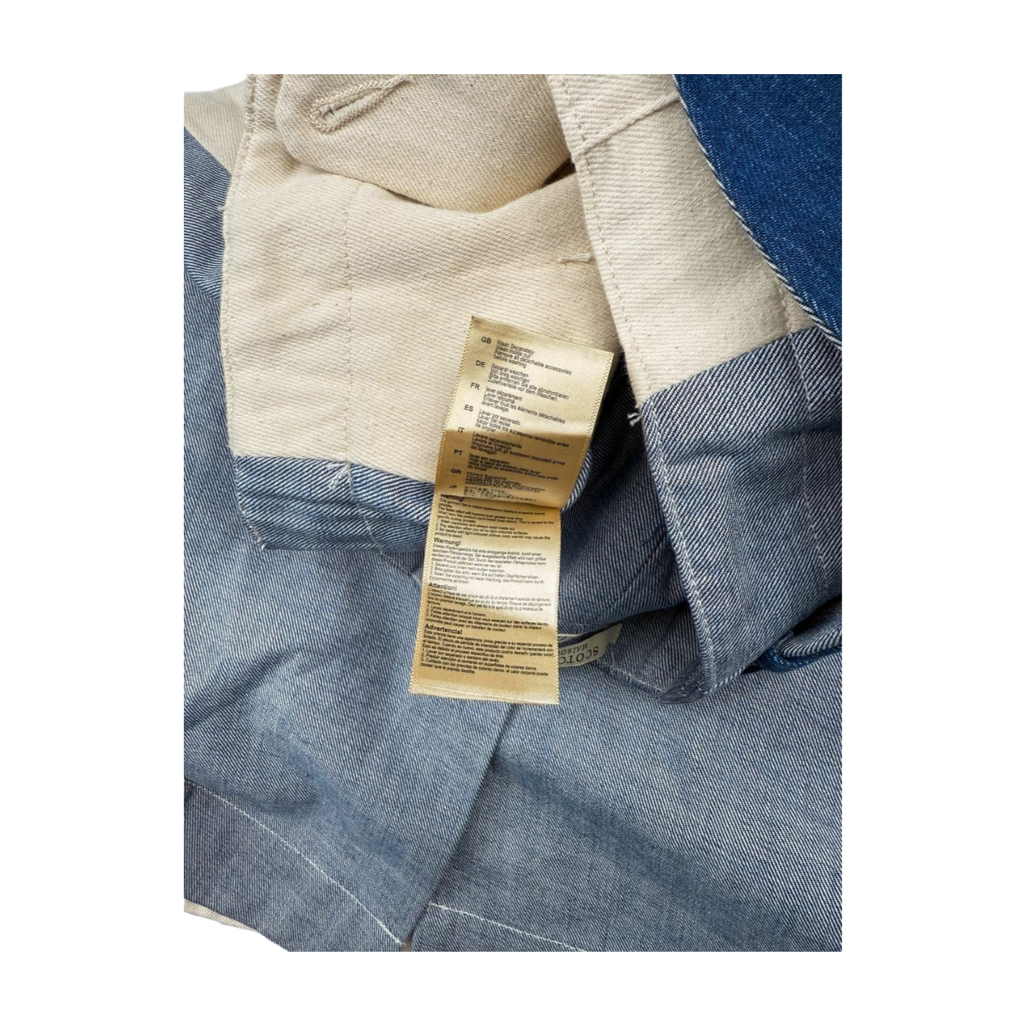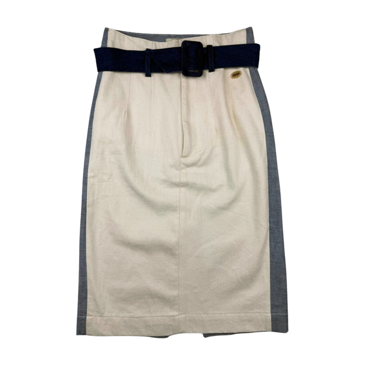 Prachtige Scotch & Soda Maison Scotch rok in crème met grijze zijkanten en een donkerblauwe denim riem. Een unieke, hoogwaardige rok met luxe uitstraling — perfect voor zomer, werk of een nette gelegenheid.