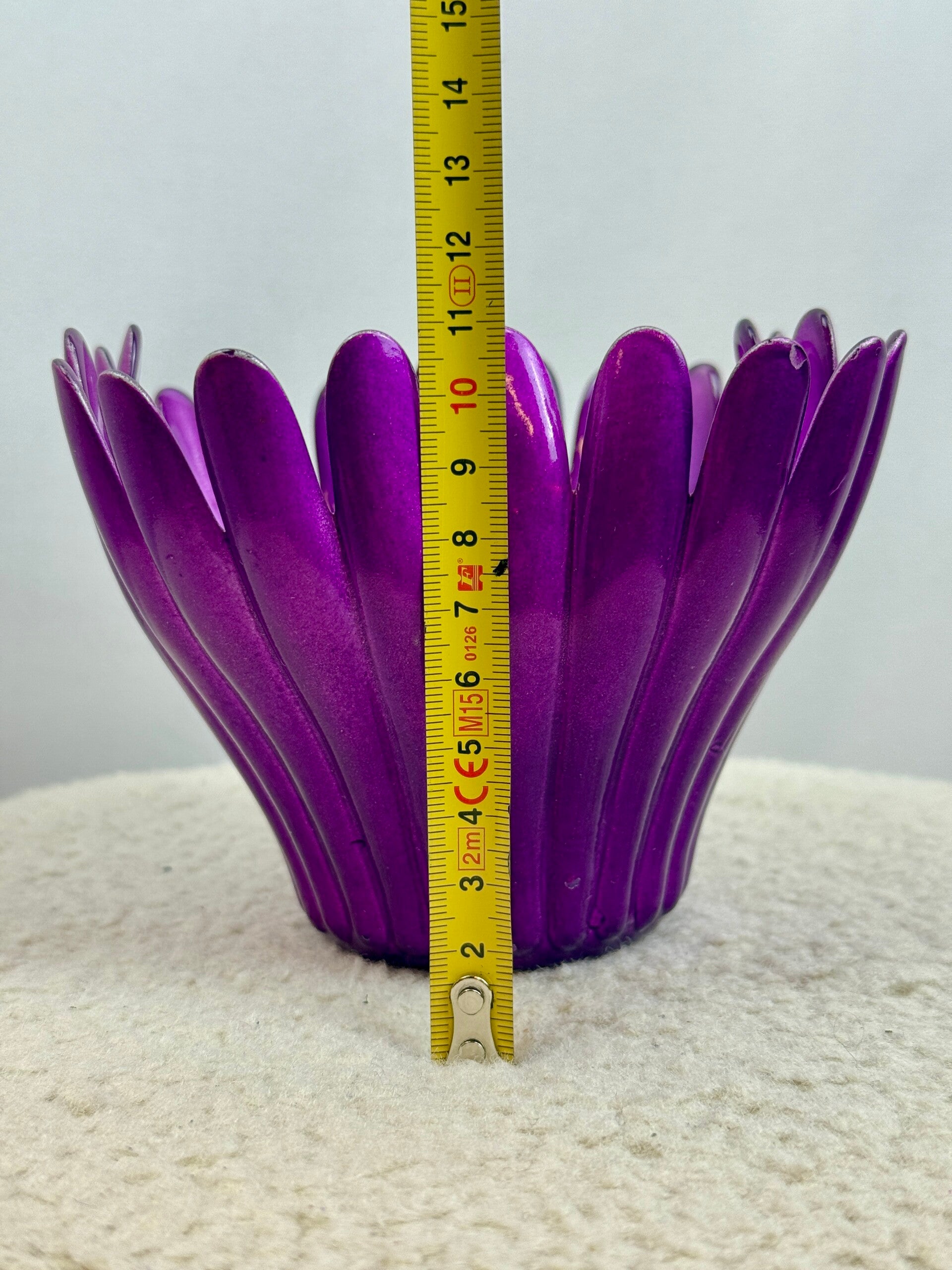 Prachtig paars glazen schaaltje in de vorm van een open bloemenkelk. Een opvallend decoratiestuk met glanzende, zachte lijnen en een diepe paarse kleur. Perfect voor sieraden, sleutels, waxinelichtje of als eye-catcher in je interieur.