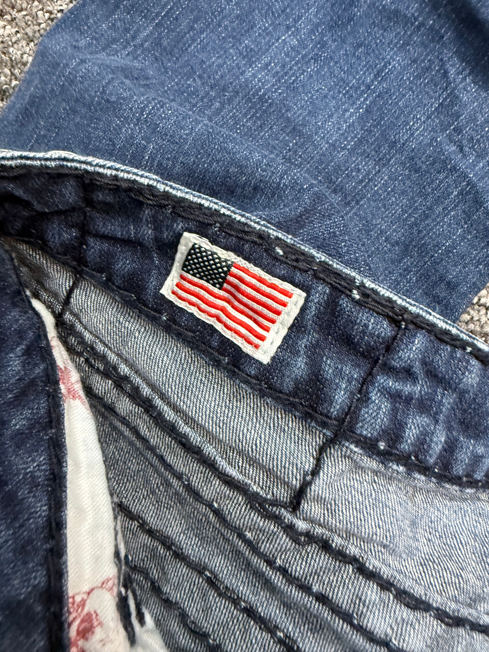 Iconische True Religion jeans met de herkenbare dikke stiksels en statement achterzakken. Deze jeans heeft een lage taille (low waist) en een mooie blauwe wassing, perfect voor een echte Y2K / early 2000s look. Gemaakt in de USA, wat hem extra gewild maakt.