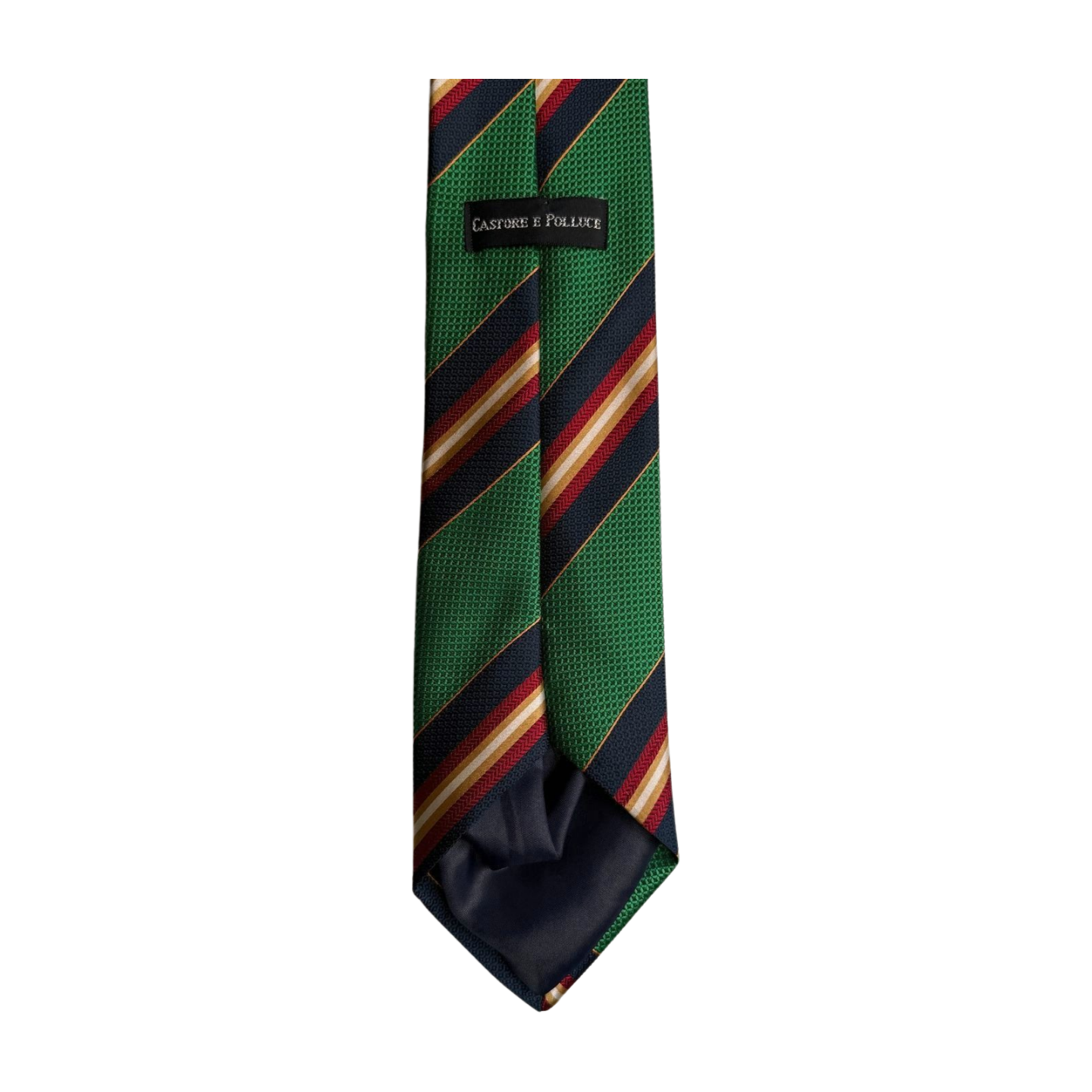 Deze klassieke Castore & Polluce stropdas heeft een stijlvolle groene basis met diagonale strepen in donkerblauw, rood en goudgeel. Een tijdloos ontwerp dat perfect past bij zowel zakelijke als formele outfits en eenvoudig te combineren is met een overhemd of colbert.
