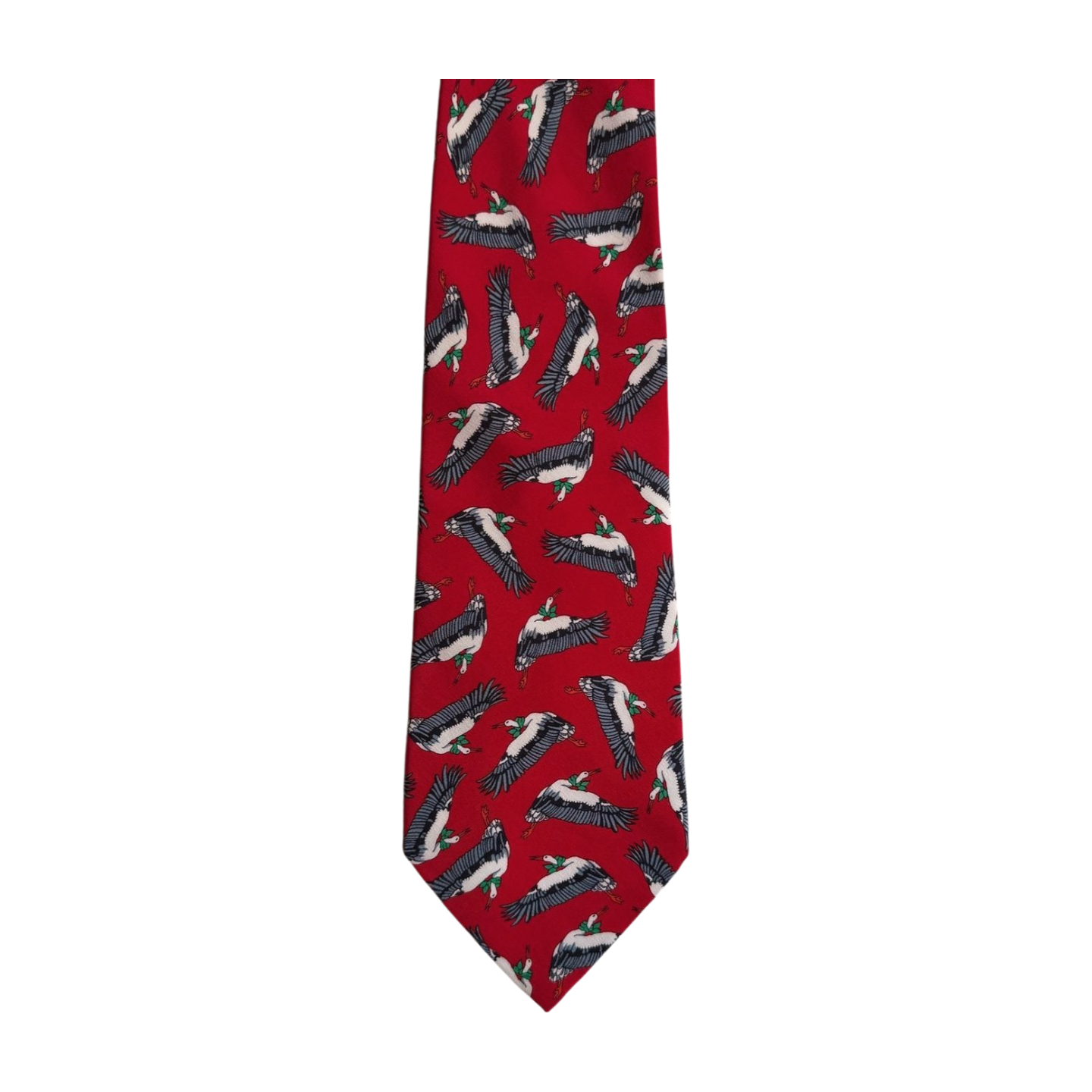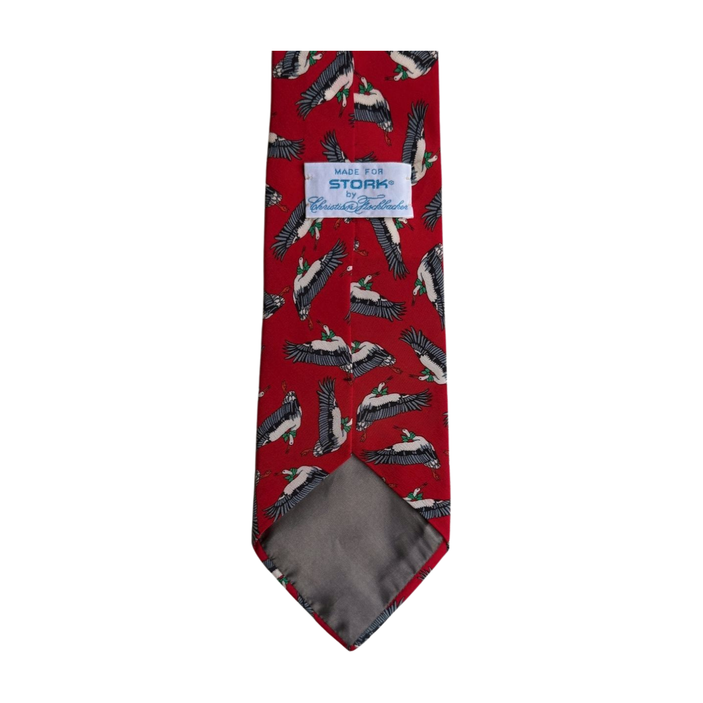 Deze opvallende Stork stropdas, gemaakt voor Stork door Christian Fischbacher, heeft een helderrode basis met een speelse all-over ooievaarprint. Het unieke patroon geeft de stropdas een karaktervolle en stijlvolle uitstraling, ideaal voor wie graag een statement maakt met zijn accessoires.