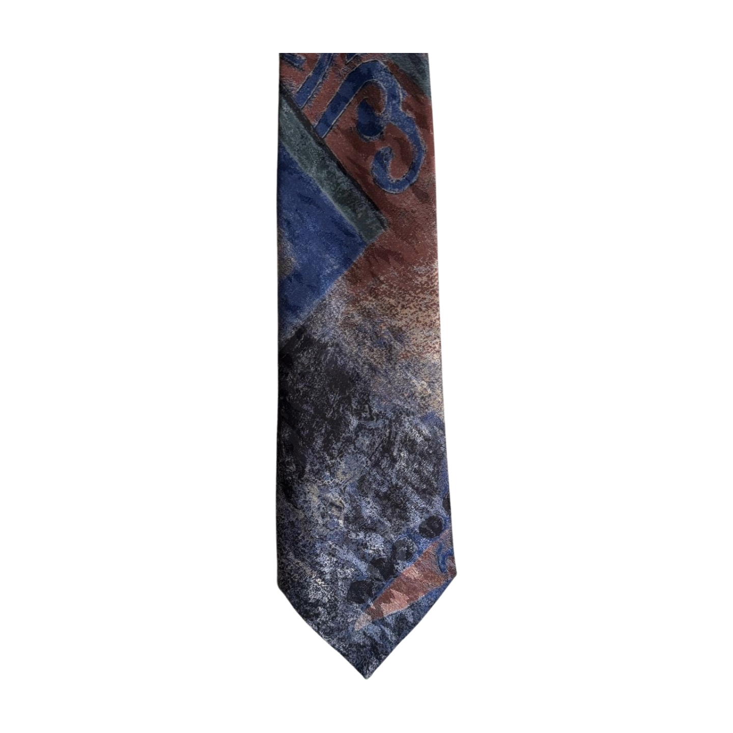 Unieke vintage stropdas met een abstract, schilderachtig patroon. De mix van diepblauw, bruin, grijs en roesttinten geeft deze stropdas een artistieke en moderne vintage uitstraling. Een echte eyecatcher die een outfit direct karakter geeft.