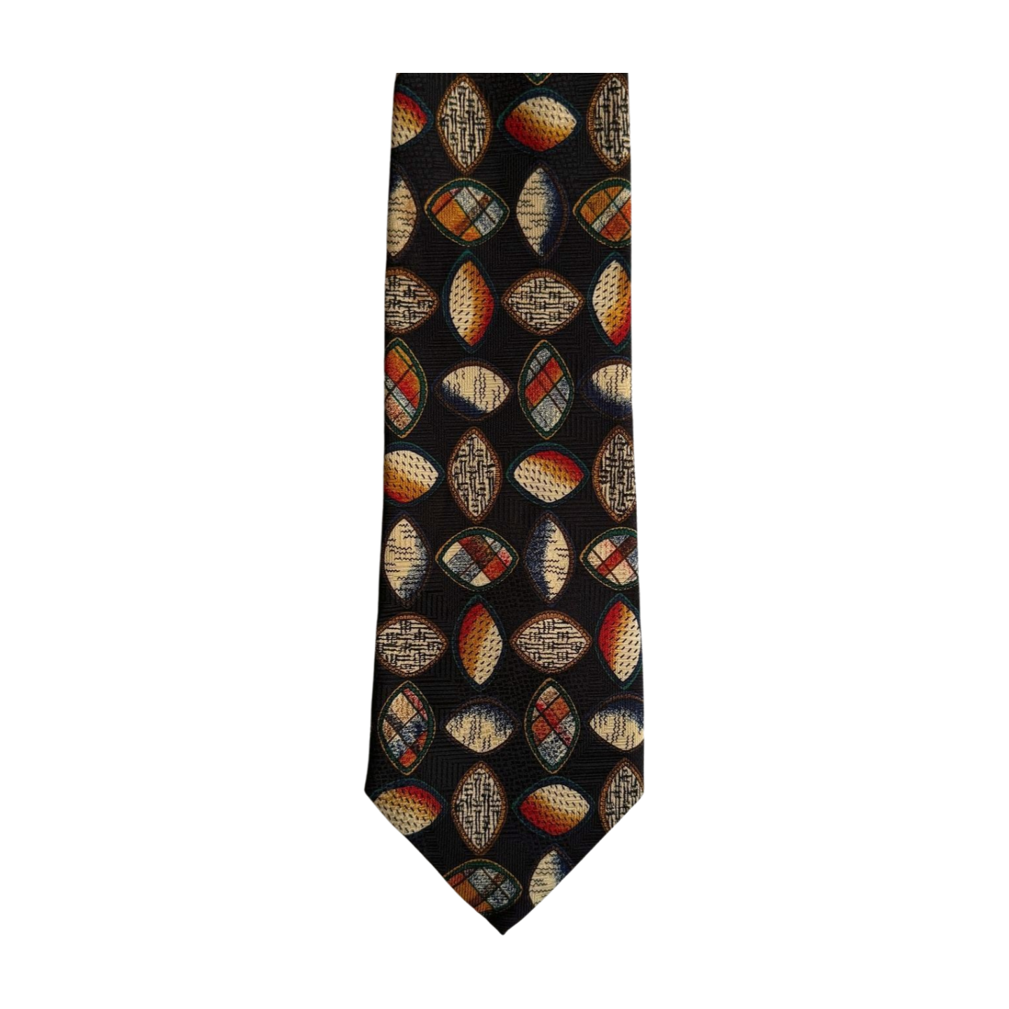 Stijlvolle vintage stropdas van HEMA met een grafisch patroon van ovale vormen. De donkere basis wordt gecombineerd met warme tinten zoals beige, blauw en oranje, wat zorgt voor een opvallende maar draagbare uitstraling. Ideaal voor een klassieke outfit met een subtiele vintage twist.