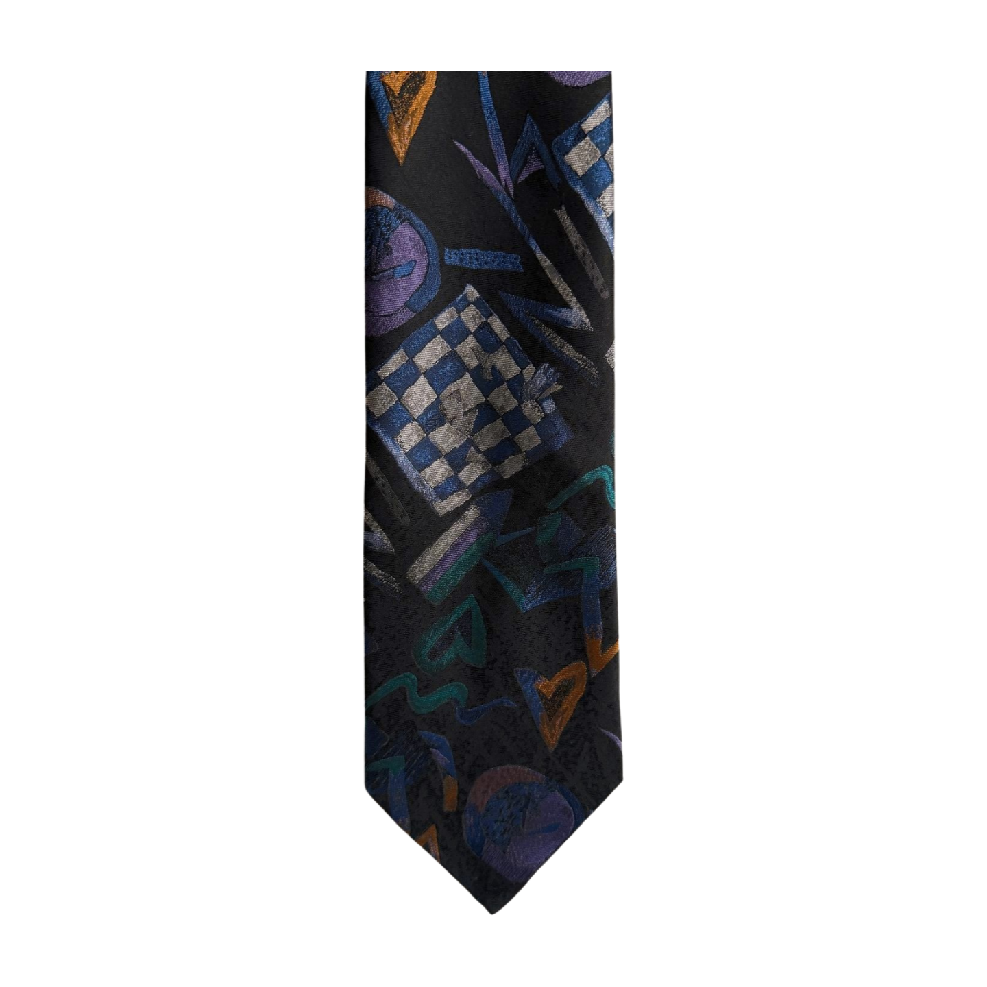 Stijlvolle vintage stropdas met een opvallend grafisch patroon. De combinatie van diep donkerblauw met speelse vormen in blauw, paars en een subtiel US-oranje accent geeft deze stropdas een echte jaren ’90 uitstraling. Ideaal om een outfit net wat unieks te geven, zowel casual chic als zakelijk.