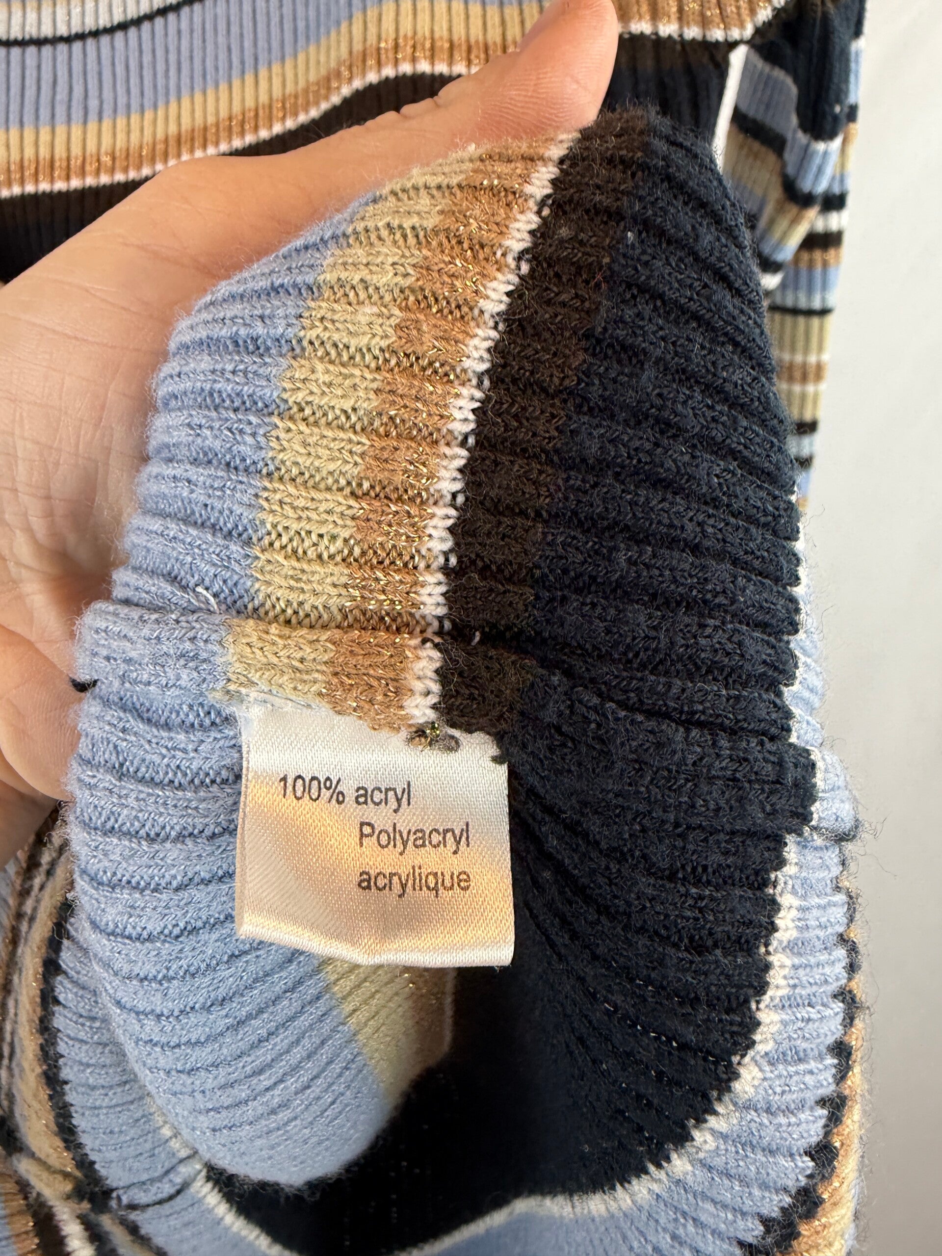 gestreepte coltrui, rib coltrui, vintage coltrui, dames trui, blauw beige trui, retro knitwear, tweedehands kleding, preloved fashion, sustainable fashion, revinty