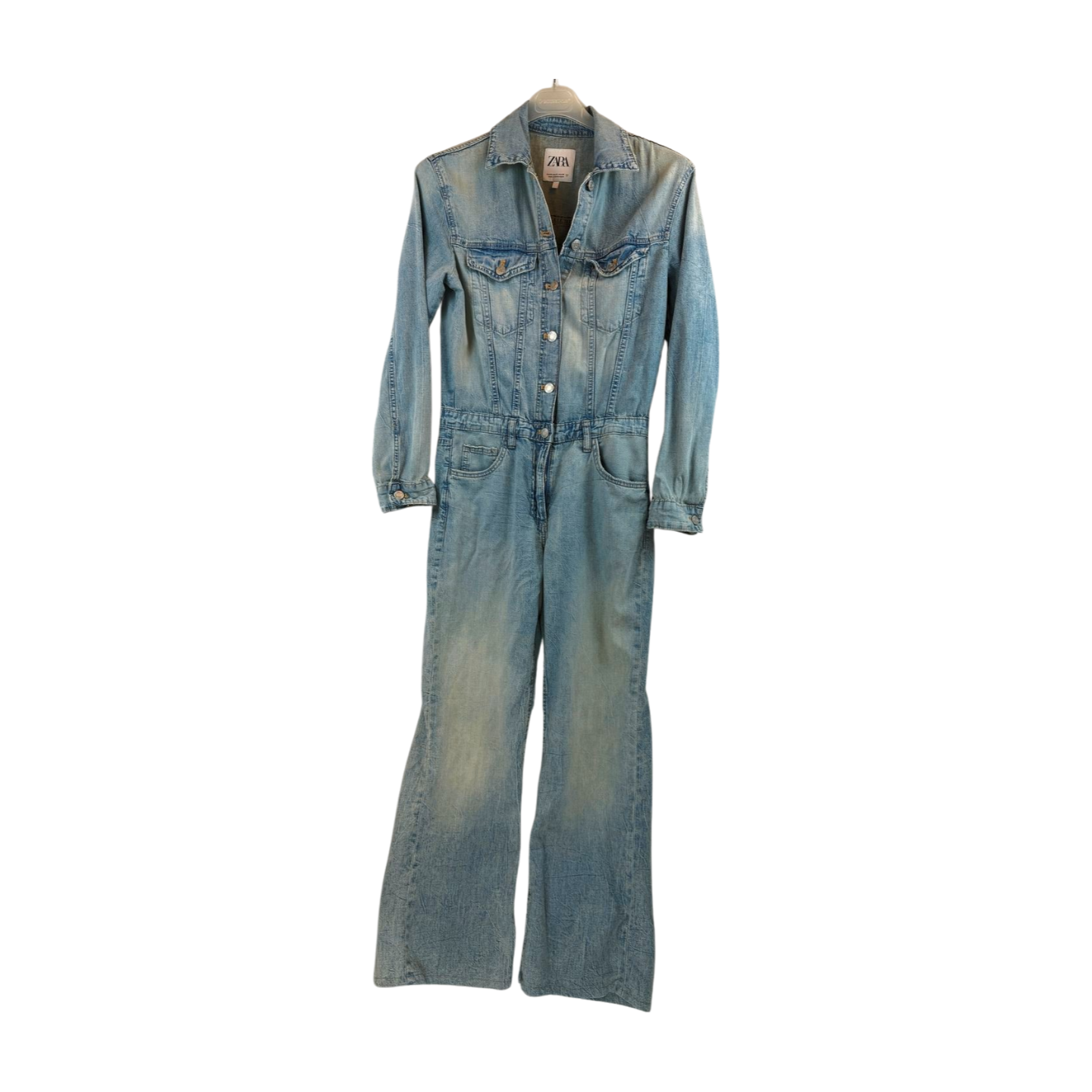 Stoere en tijdloze denim jumpsuit van Zara in een lichtblauwe wassing. Dit item heeft een klassieke workwear uitstraling met borstzakken, knoopsluiting en een taille die mooi aansluit. De rechte pijpen en lange mouwen geven de jumpsuit een echte retro/vintage vibe. Perfect als statement piece, zowel casual als gestyled met hakken of sneakers.