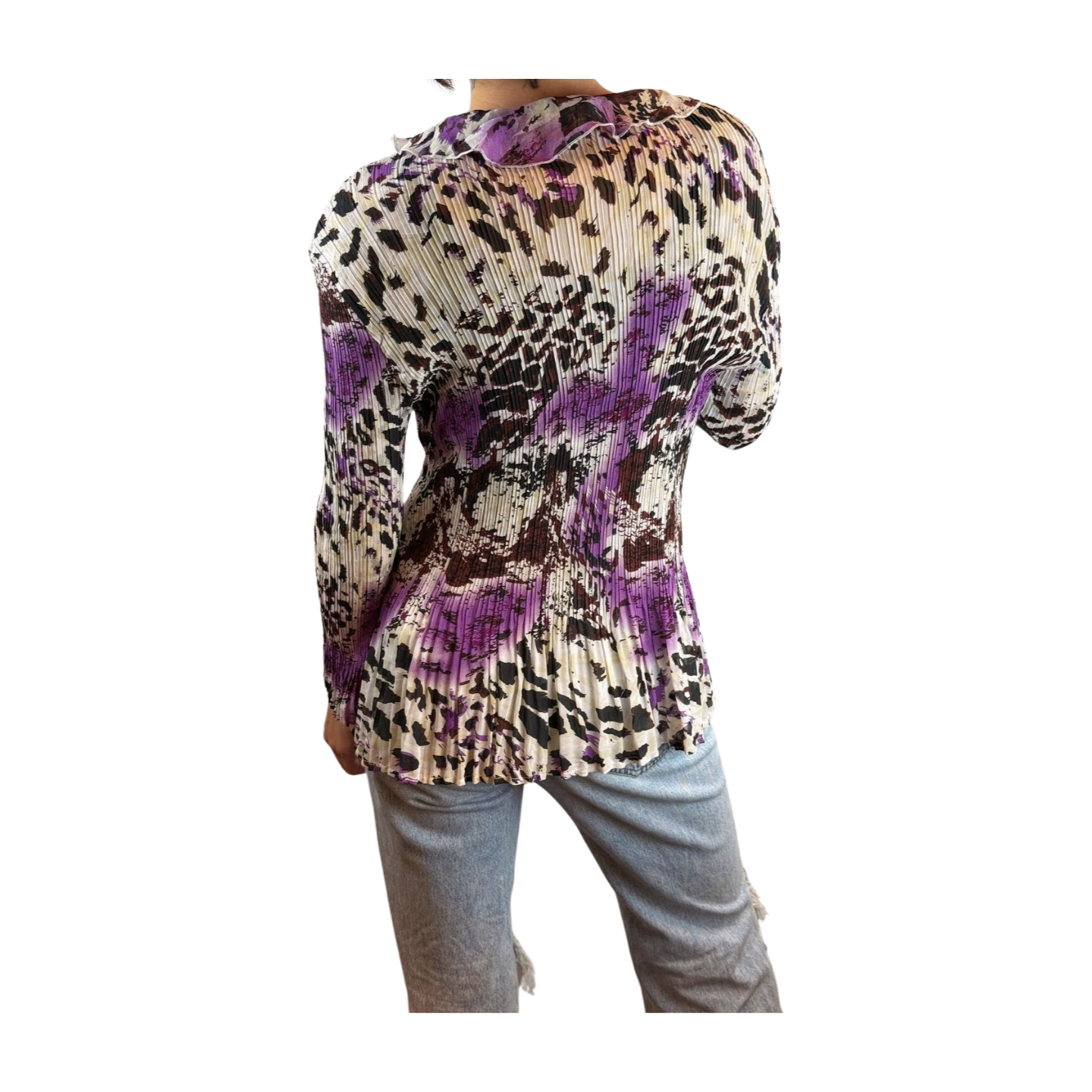 Vintage geplisseerde blouse met ruches – paars animal print – dames