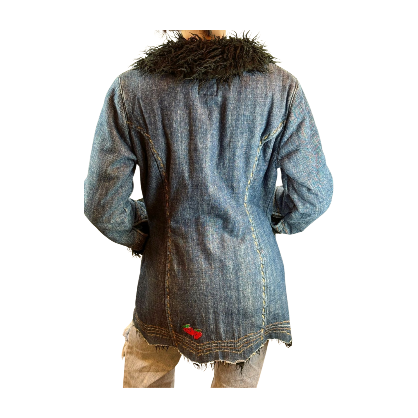 Vintage denim jas met faux fur & patches – statement Y2K