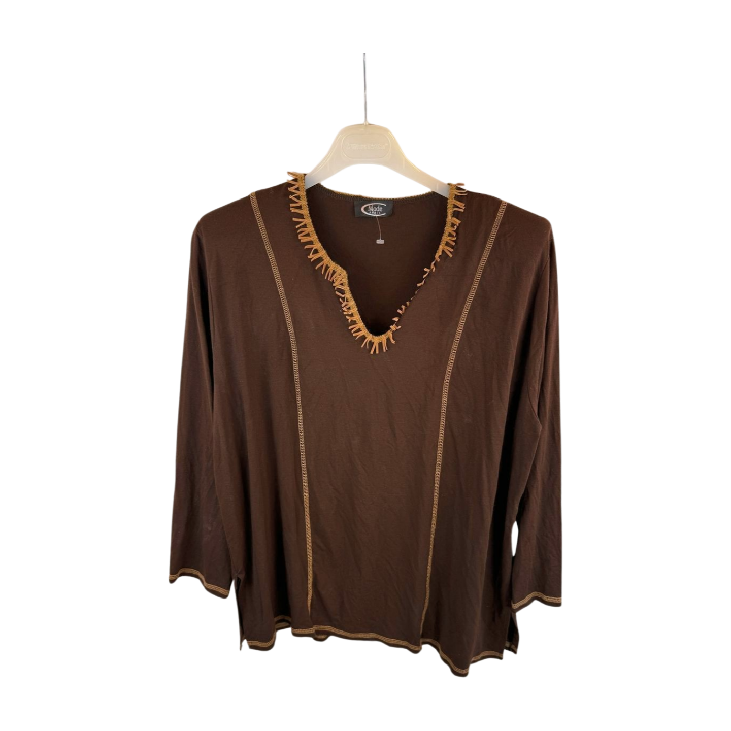 Stijlvolle bruine top van Mode Paris met een elegante V-hals en decoratieve afwerking langs de halslijn. Fijne, soepelvallende stof met lichte stretch, waardoor de top comfortabel draagt en mooi aansluit. Ideaal voor zowel casual als geklede outfits.