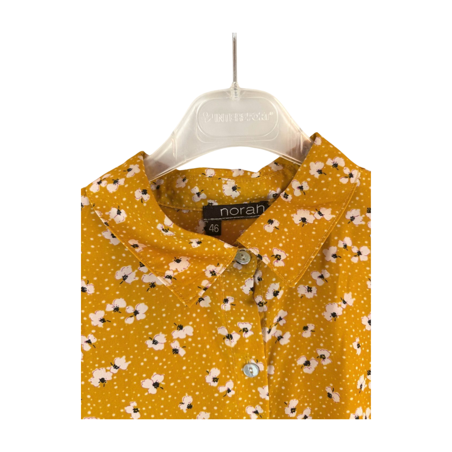 Mooie Norah tuniek in een warme okergele kleur met fijne bloemenprint. Het model heeft een klassieke kraag, knoopsluiting en een soepel vallende pasvorm. Ideaal om zowel casual als netjes te dragen, los of met een riem. Een tijdloos en comfortabel item voor elke garderobe.