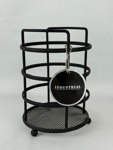 Stoere industriële organizer van zwart metaal met open rasterbodem. Door het ronde ontwerp en de robuuste afwerking is dit item zowel praktisch als decoratief. Perfect voor het opbergen van keukengerei, flessen, toiletartikelen, pennen of andere accessoires.