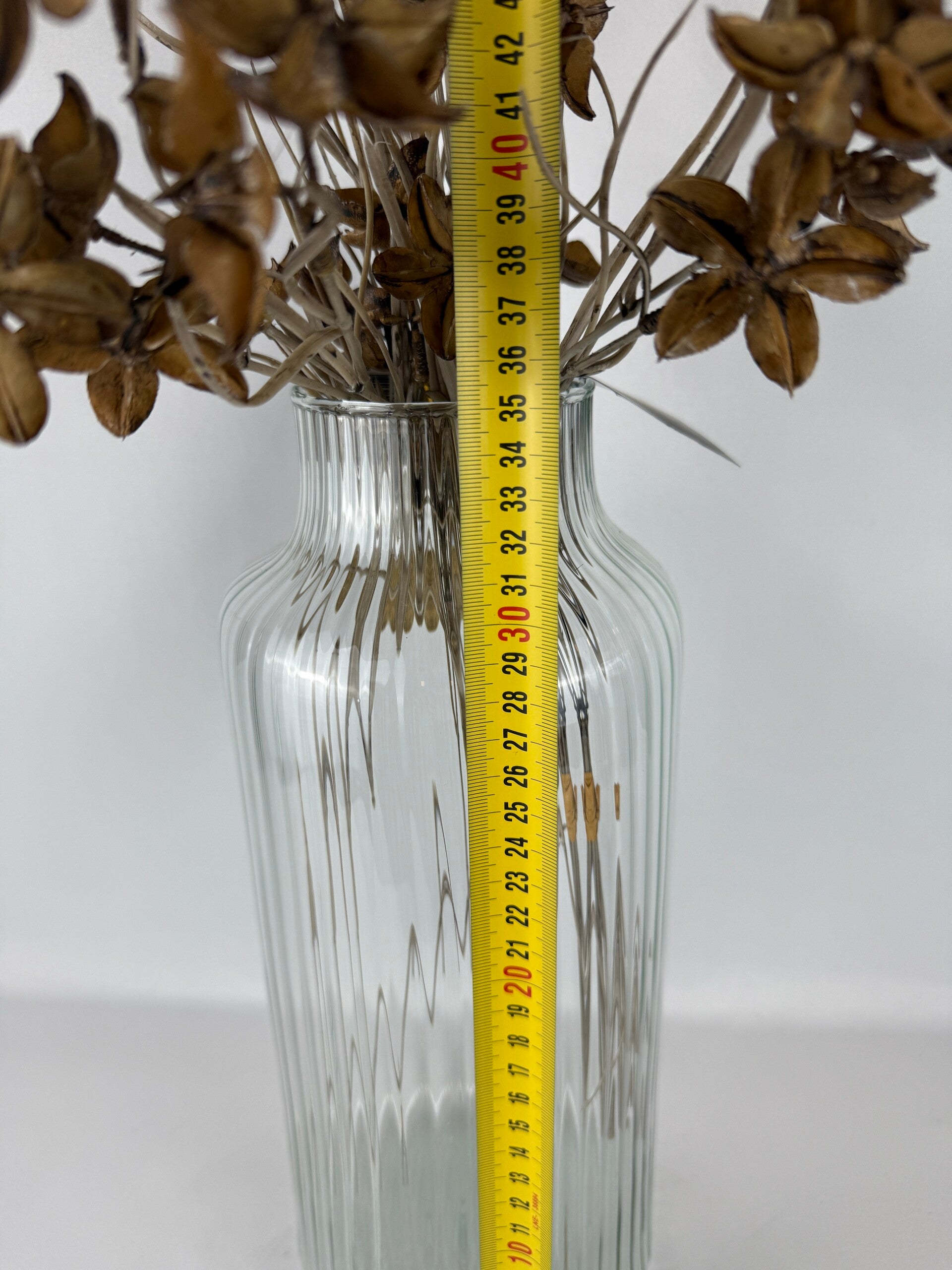 glazen vaas, hoge vaas, ribbel vaas, eco glas, gerecycled glas, transparante vaas, Scandinavisch interieur, boho woondecoratie, minimalistische vaas