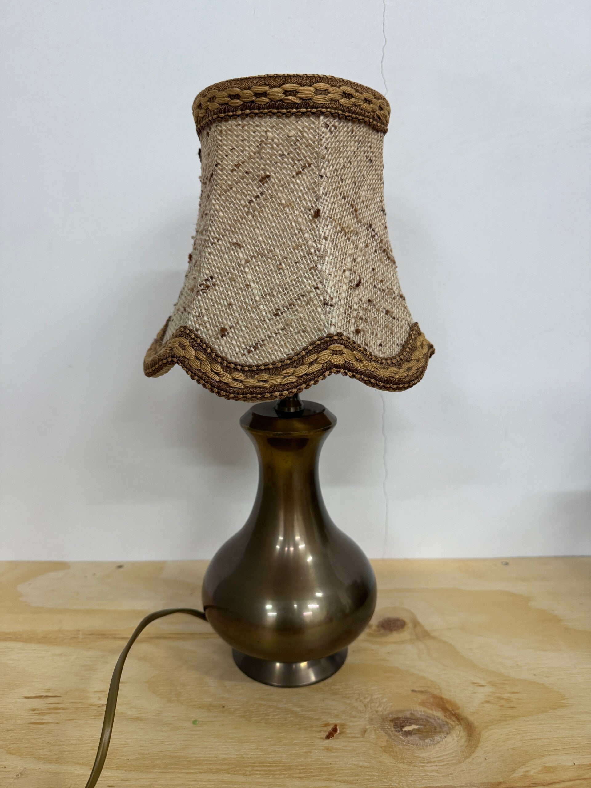 Sfeervolle vintage tafellamp met een elegante, bronskleurige lampvoet en een originele stoffen lampenkap met decoratieve bies. Geeft een prachtig warm en zacht licht wanneer hij aanstaat – perfect voor een gezellig interieur.