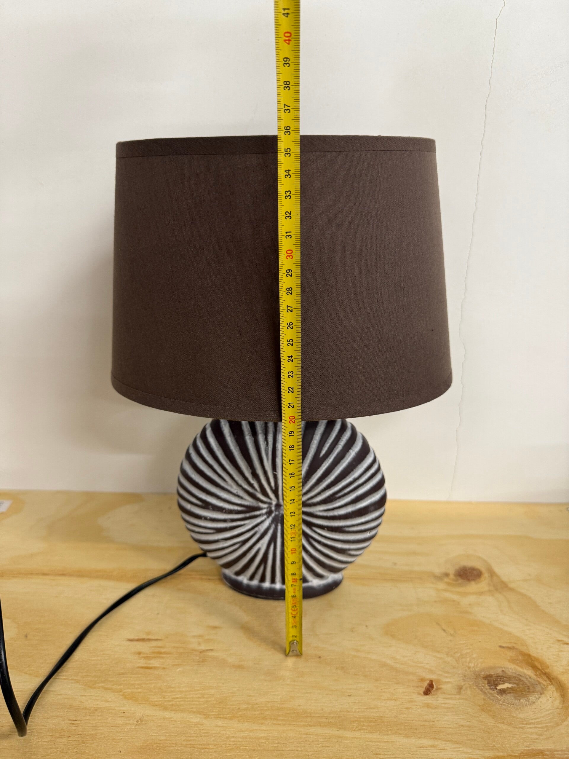 Stijlvolle vintage tafellamp met een opvallende keramische voet in reliëfstructuur. De ronde vorm met diepe lijnen geeft de lamp een luxe en karaktervolle uitstraling. De warme bruine stoffen kap zorgt voor een zacht en sfeervol licht, perfect voor een cozy interieur.